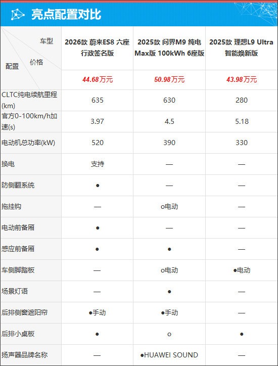 具体到车辆配置层面,通过对比来看,蔚来ES8与问界M9旗鼓相当,但两者的侧重点有所不同。其中互盈在线,蔚来ES8不仅官方0-100km/h加速时间最快,而且独享防侧翻系统、电动前备厢,同时还支持换电功能。问界M9则独享场景灯语、配备HUAWEI SOUND扬声器,并提供电动拖挂钩的选装。相比之下,理想L9在高阶配置上稍显逊色,并无太多突出的亮点。