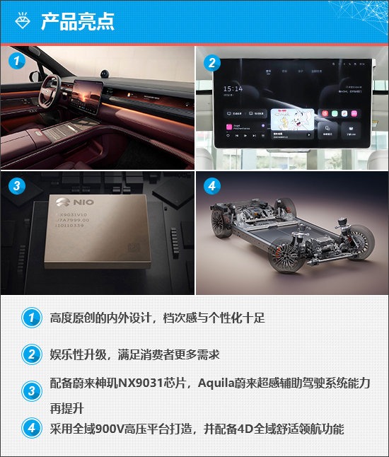 辅助驾驶方面,新车配备蔚来神玑NX9031辅助驾驶芯片,其采用5nm车规级工艺。Aquila蔚来超感知系统拥有31个硬件互盈在线,包括超远距高精度激光雷达1个、侧边广角激光雷达2个以及4D成像雷达1个等等。可实现点到点全域领航辅助和丰富的智能泊车辅助,用车体验再升级。