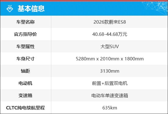 售后服务政策方面,2026款蔚来ES8整车质保三年或12万公里(首任车主六年或15万公里),三电首任车主质保政策为十年不限里程(责任免除条款以官方为准)。